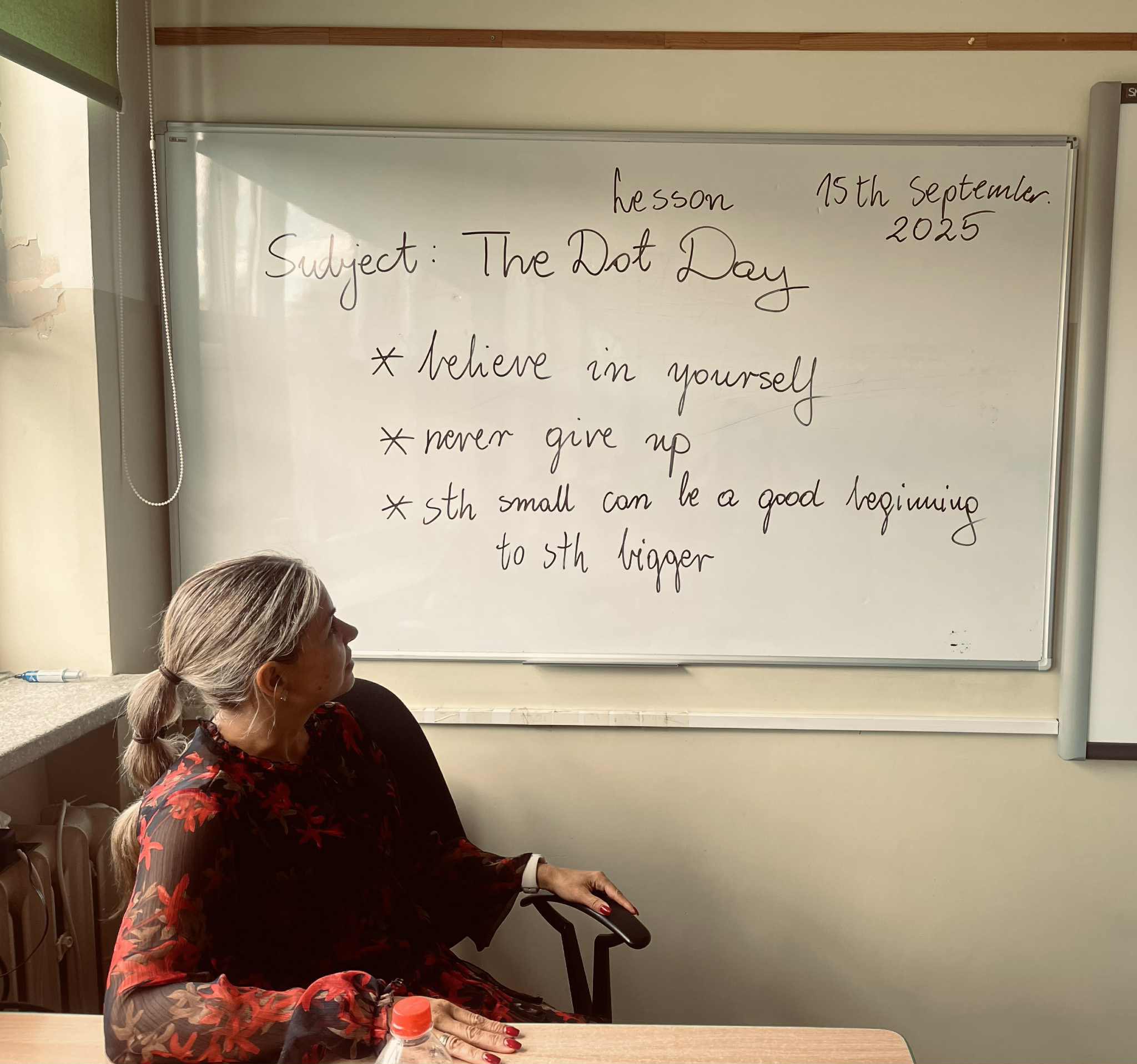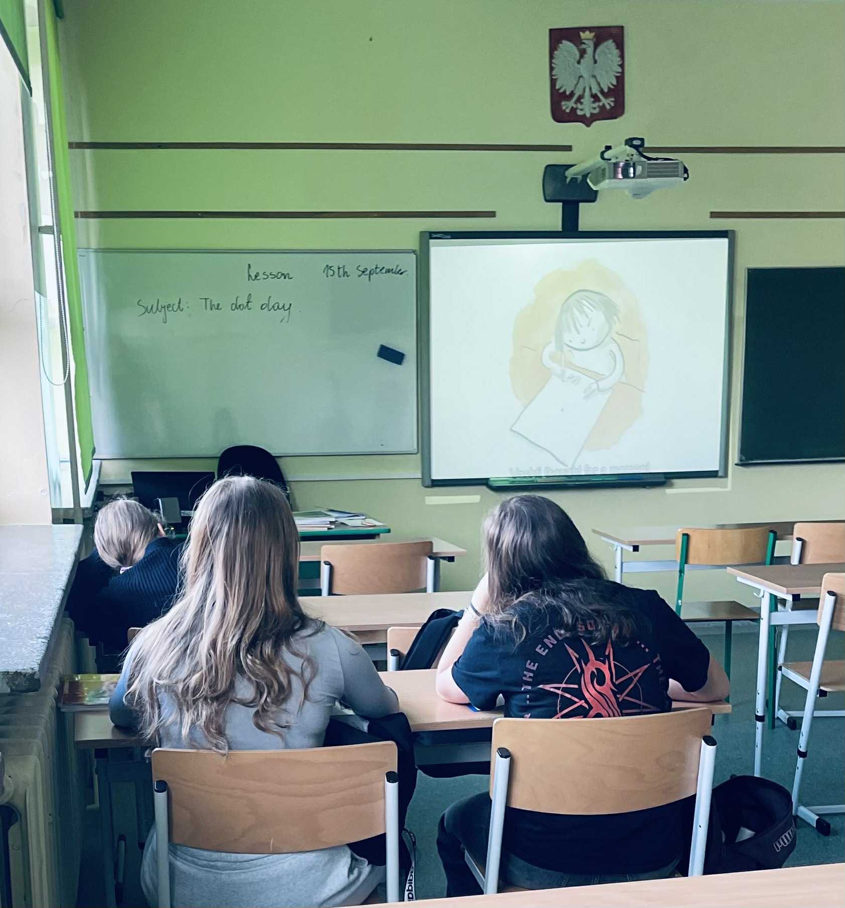 Inspiracją była książka „The Dot” autorstwa Petera H. Reynoldsa, opowiadająca historię dziewczynki o imieniu Vashti, która dzięki jednej małej kropce i wsparciu nauczycielki odkrywa w sobie artystyczny potencjał. Tego dnia wszystkie dzieci w naszej szkole miały okazję do tworzenia podczas przerw wspaniałych dzieł sztuki stworzonych z kropek. Szkoła zamigotała wieloma kolorami. Podkreślając temat dnia, nauczyciele podczas lekcji motywowali swoich uczniów do kreatywności poprzez różnorodne zadania związane ze wzbogacaniem słownictwa jak i tworzeniem ciekawych historii. Szczególnie ważnym przesłaniem tego dnia stały się słowa: „Believe in yourself and never give up because everyone is special”.